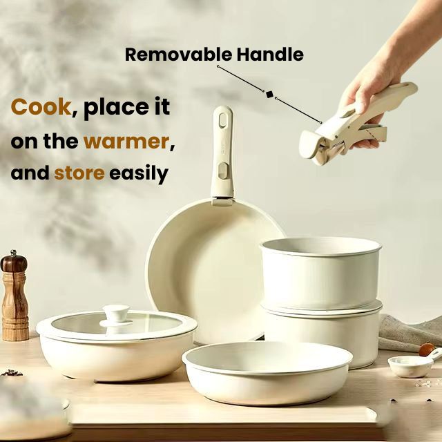 4-piece nonstick pan set for cooking and placing on the warmer, with a removable handle